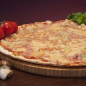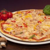 Pizza sauce, cheese, smoked chicken, sweet pepper, corn, pineapple