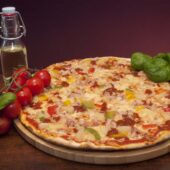 Pizza sauce, cheese, pepperoni, ham, sweet pepper, champignons, pineapple