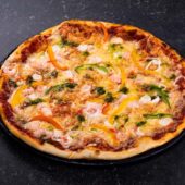 Pizza sauce, cheese, shrimps, crab sticks, sweet pepper, pesto