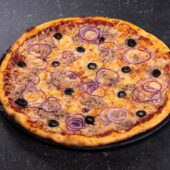 Pizza sauce, cheese, tuna fish, olives, onion rings