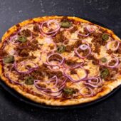 HOT PIZZA: Tex-mex sauce, cheese, barbeque minced meat, garlic, onion rings, jalapeno